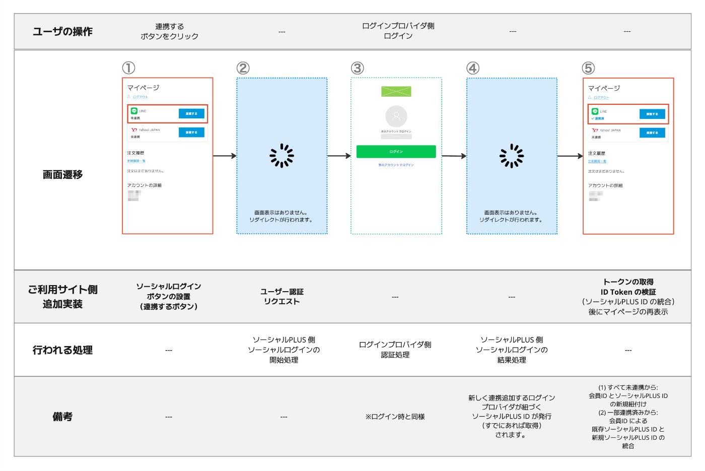 ユーザー認証リクエスト(②〜⑱)、トークンの取得(⑲〜⑳)、ID Token の検証(㉑〜㉓)を経て「ソーシャルPLUS ID」を特定(㉔)した状態で、ログイン中のユーザーの「お客様サービス側ユーザID」と「ソーシャルPLUS ID」を紐付け(㉕〜㉖)ます。