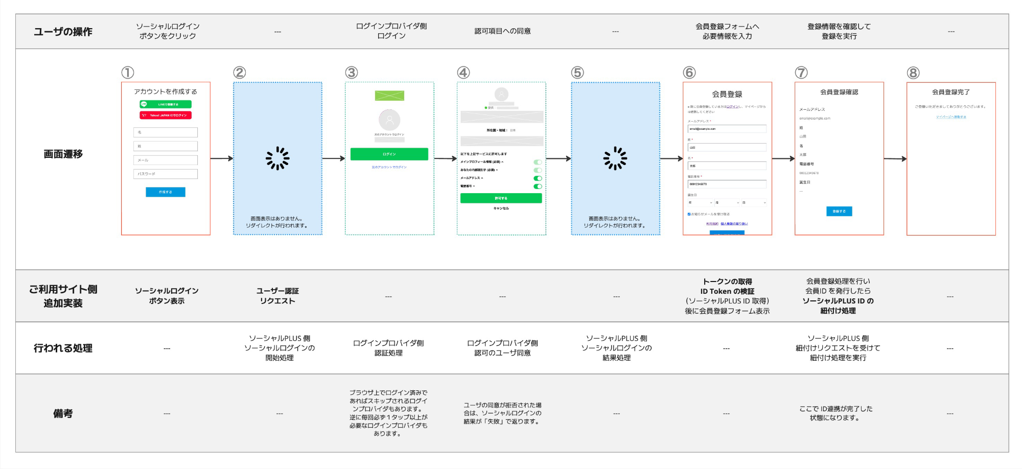 ソーシャルログイン(ID 連携)を含む「会員登録」のサービス実装イメージを例示します。