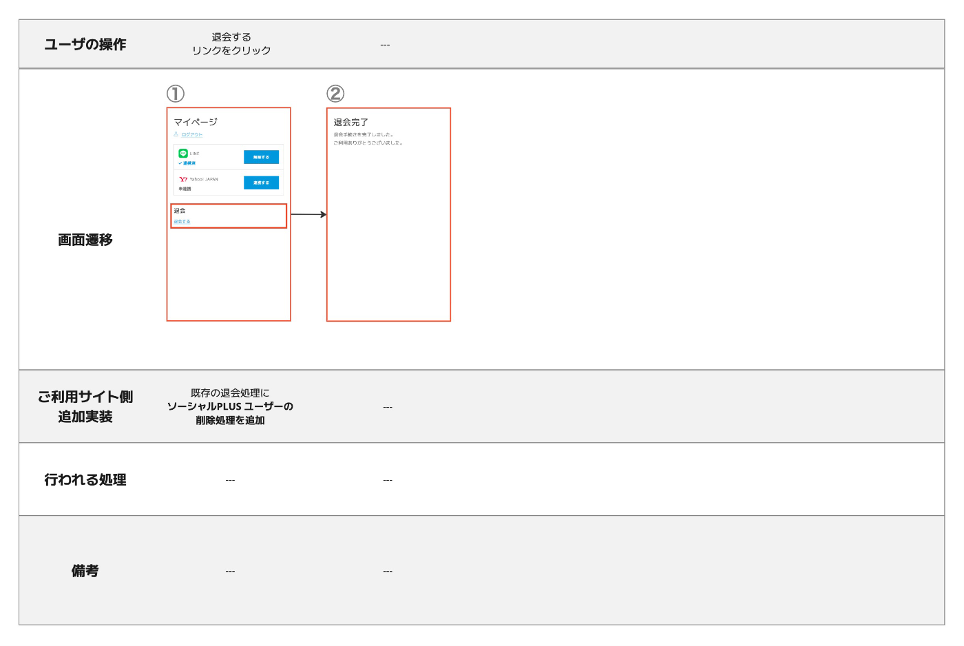 「ソーシャルPLUS ID」の削除に失敗したままご利用サービス側の退会(ユーザID 削除)が完了されますと、ユーザーが再度ソーシャルログインから会員登録などを行おうとした場合に "連携済み" と判断されてしまう可能性がございます。「ソーシャルPLUS ID」の削除も正常に完了されたことを留意して退会処理を行ってください。